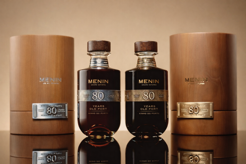 Vinte garrafas. Oitenta anos de envelhecimento em casco no Douro. Acaba de chegar ao Brasil, em pré-venda na loja da Menin Wine na Wine Trader, o raro Menin Porto 80 Anos. O lote representa apenas 15% da produção mundial lançada pela vinícola portuguesa em setembro. De tonalidade âmbar profunda, antecipa aromas complexos de caramelo salgado, especiarias, frutas secas e notas cítricas confitadas. O rótulo chega em duas versões de 500 ml.