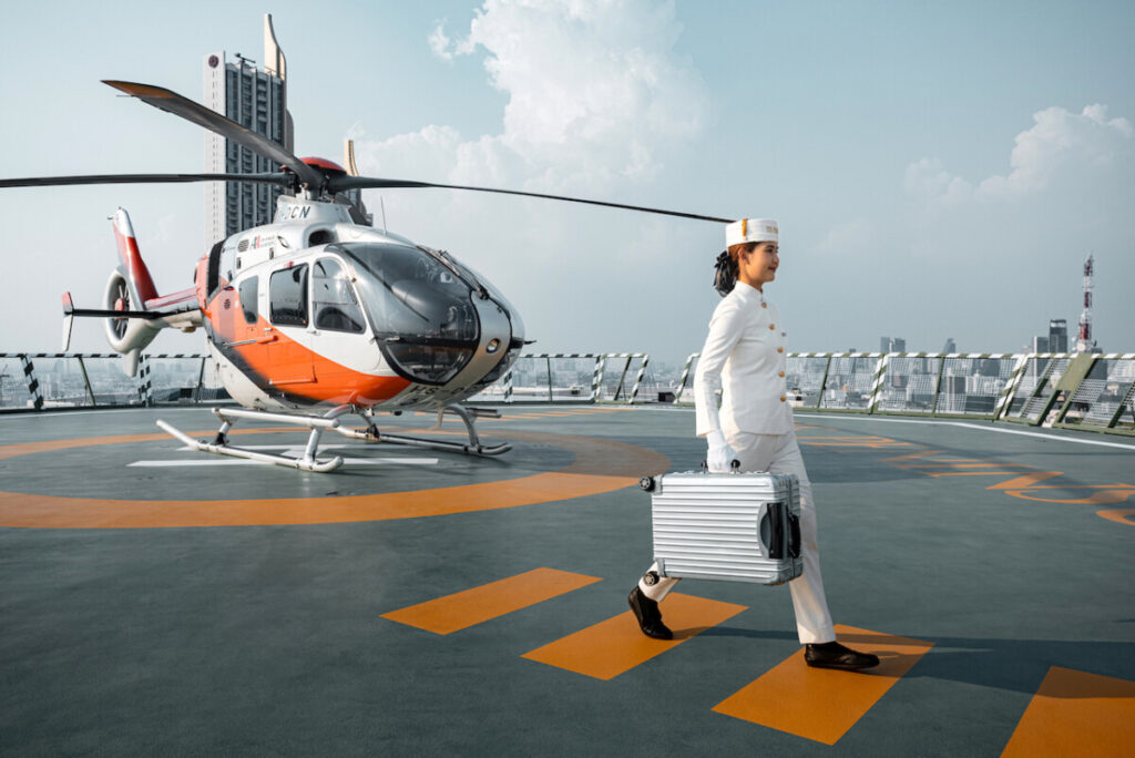 Helicóptero particular decola diretamente do rooftop do hotel The Peninsula em Hong Kong