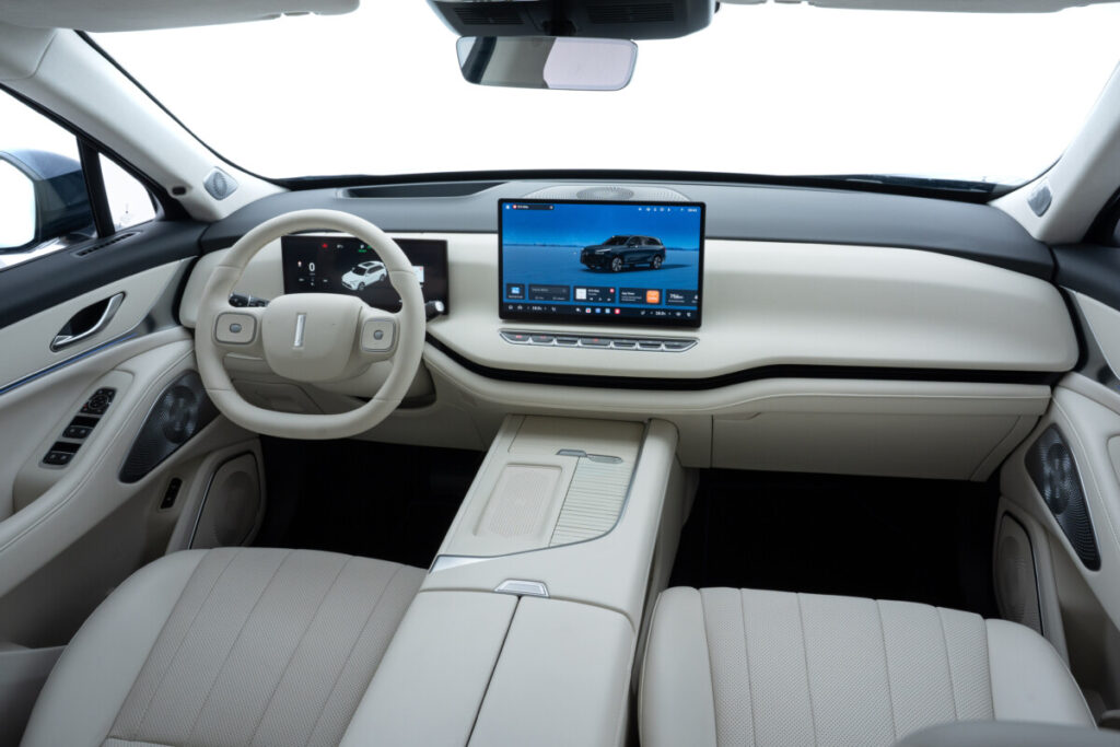 O design também é um diferencial marcante. As linhas são limpas, proporcionais e sofisticadas, transmitindo uma elegância serena e sem excessos. A frente minimalista, com faróis full LED matriciais, reforça o caráter contemporâneo. As laterais têm superfícies contínuas e linhas de caráter bem definidas, ressaltadas pelas rodas de 21 polegadas e maçanetas retráteis, enquanto a traseira exibe lanternas horizontais unidas por uma faixa luminosa. O resultado é um estilo equilibrado, com clara influência europeia, que traduz com precisão a ideia de luxo discreto que norteia a marca.
