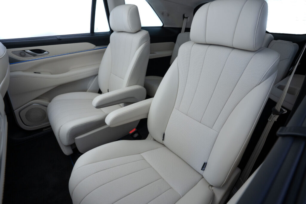 A segunda fileira é o ponto alto do modelo. Duas poltronas individuais de grandes dimensões oferecem ajustes elétricos, massagem, aquecimento, ventilação e inclinação de até 50 graus. É um padrão de conforto digno de classe executiva. O passageiro dianteiro também tem atenção especial: seu assento com função gravidade zero reclina a 110 graus, criando uma posição que distribui perfeitamente o peso do corpo e reduz a pressão na coluna. O resultado é uma sensação real de flutuar, reforçada pela suavidade da condução e pelo silêncio da cabine.